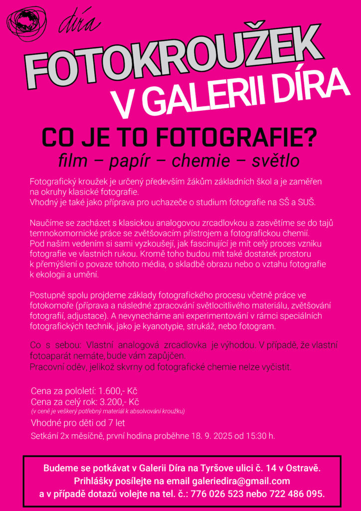 Účastníkům doporučujeme zajištění pracovního oděvu, skvrny od vývojky nelze vyčistit. Fotochemie je v ceně workshopu.